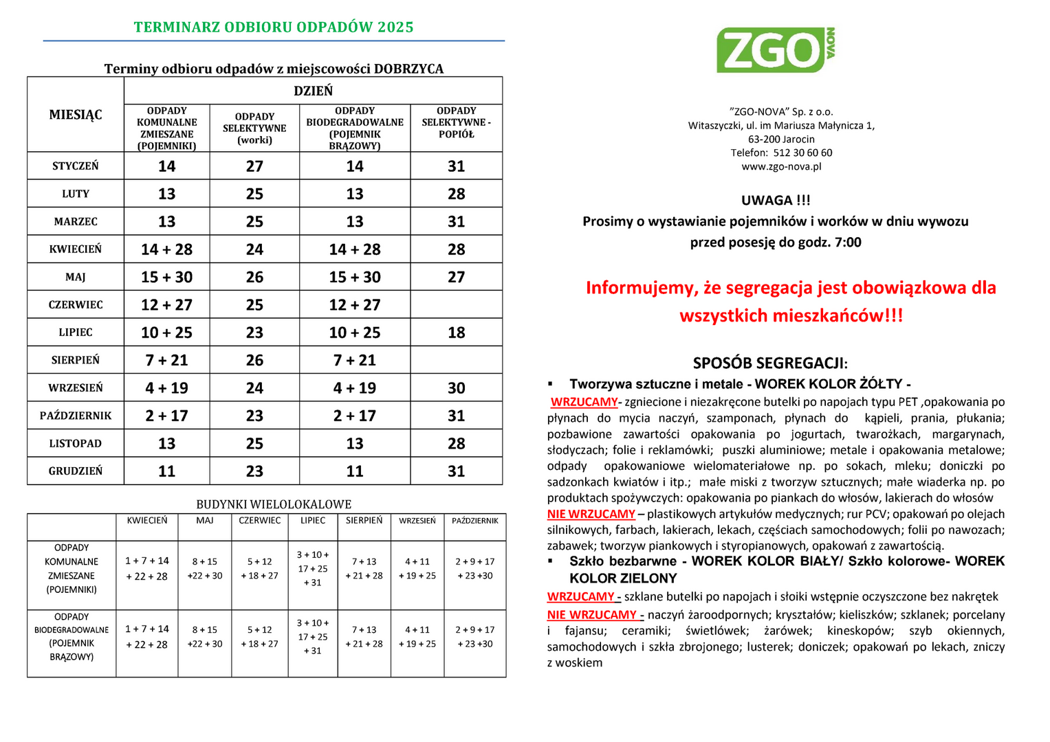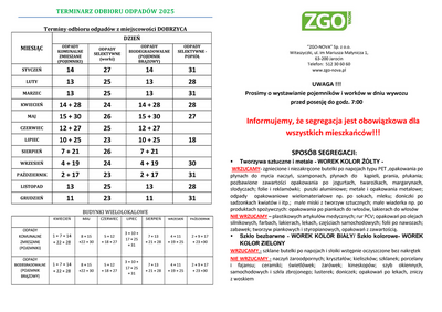 Terminy odbioru odpadów z miejscowości DOBRZYCA