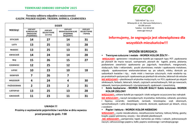 Terminy odbioru odpadów z miejscowości GALEW, POLSKIE OLĘDRY, TRZEBIN, SOŚNICA, CZARNUSZKA