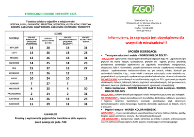 TERMINARZ ODBIORU ODPADÓW NA 2025 ROK
