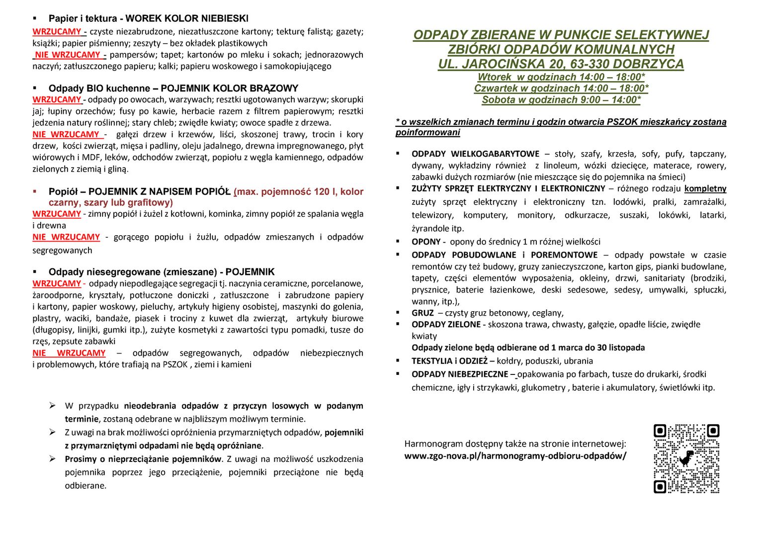 - W przypadku nieodebrania odpadów z przyczyn losowych w podanym terminie, wykonanie usługi nastąpi w pierwszą sobotę po planowanym wywozie.