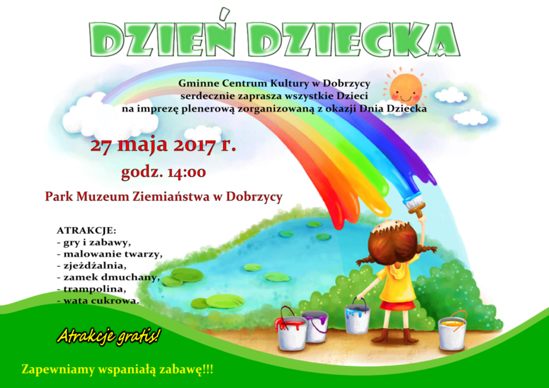 Dzień Dziecka' 2017 Opublikowano: 24 maja 2017 08:52 Kategoria: Aktualności WydrukujDo góry Wyświetleń: 1272 Zobacz również02.06.2017 XV Edycja Regionalnego Konkursu Wiedzy 02.06.2017 Komunikat w/s zamknięcia ulic dla ruchu kołowego... 25.05.2017 ZAPROSZENIE NA DNI DOBRZYCY 2017. 24.05.2017 Dzień Dziecka' 2017 24.05.2017 Majówka 2017 28.04.2017 Fotorelacja ze spotkania z poezją śpiewaną.