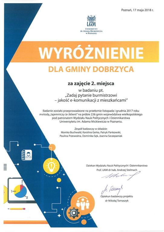 W dniu dzisiejszym Burmistrz Gminy Dobrzyca oraz Przewodniczący Rady Miejskiej Gminy Dobrzyca wzięli udział w podsumowaniu projektu pn. "Zadaj pytanie burmistrzowi - jakość e-komunikacji z mieszkańcami". Ww. badanie zostało przeprowadzone przez zespół badawczy na przełomie listopada i grudnia 2017 roku metodą "tajemniczy (e-)klient" na próbie 226 gmin województwa wielkopolskiego pod patronatem Wydziału Nauk Politycznych i Dziennikarstwa Uniwersytetu im. Adama Mickiewicza w Poznaniu.