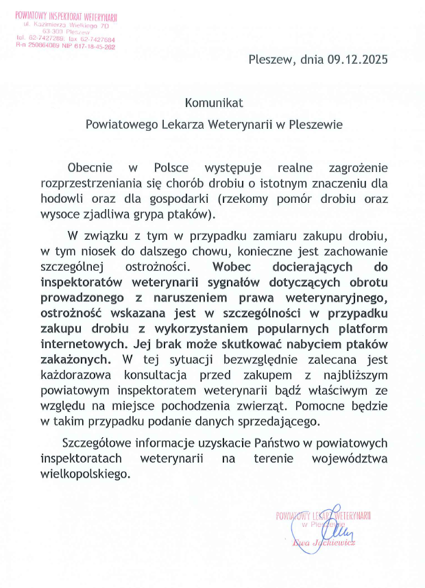 Komunikat Powiatowego Lekarza Weterynarii w Pleszewie