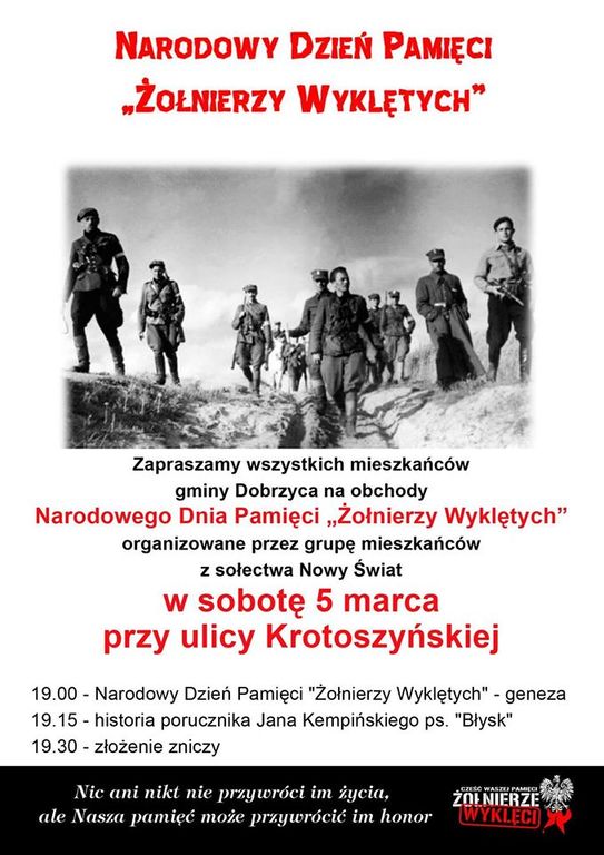 5 marca 2016 r. o godz. 19:00 w Dobrzycy przy ulicy Krotoszyńskiej odbyła się uroczystość związana z obchodami Narodowego Dnia Pamięci „ Żołnierzy Wyklętych”. Inicjatorami przedsięwzięcia byli mieszkańcy sołectwa Dobrzyca Nowy Świat oraz Urząd Miejski Gminy Dobrzyca. W trakcie uroczystości miały miejsce: odczyt dotyczący genezy obchodów Narodowego Dnia Żołnierzy Wyklętych, prezentacja multimedialna przedstawiający historię życia porucznika Jana Kępińskiego ps. „Błysk”.