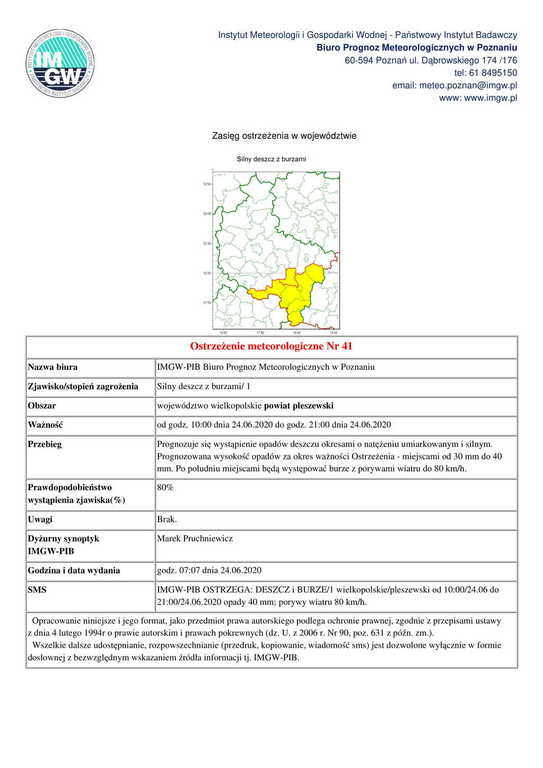 Ostrzeżenie meteorologiczne Nr 41 - Silny deszcz z burzami/1 Opublikowano: 24 czerwca 2020 08:49 Kategoria: Komunikaty i ostrzeżenia WydrukujDo góry Wyświetleń: 383 Zobacz również07.08.2020 Ostrzeżenie meteorologiczne Nr 54 - Upał/ 2 20.07.2020 Ostrzeżenie meteorologiczne Nr 50 - Burze z... 10.07.2020 Ostrzeżenie meteorologiczne Nr 46 - Burze z... 24.06.2020 Ostrzeżenie meteorologiczne Nr 41 - Silny deszcz... 24.06.2020 Informacja o książkach ewidencji pobytu na... 22.06.2020 Ostrzeżenie meteorologiczne Nr 39 - Silny deszcz...