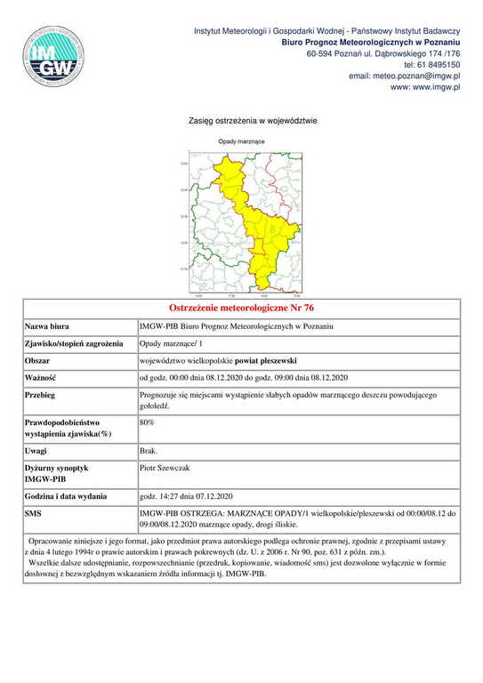Ostrzeżenie meteorologiczne nr 76 - opady marznące / 07.12.2020 r. Opublikowano: 07 grudnia 2020 16:32 Kategoria: Komunikaty i ostrzeżenia WydrukujDo góry Wyświetleń: 403 Zobacz również12.01.2021 Ostrzeżenie meteorologiczne nr 4 - oblodzenie/1 -... 21.12.2020 Harmonogram polowań zbiorowych 10.12.2020 Ostrzeżenie meteorologiczne nr 77 - opady... 07.12.2020 Ostrzeżenie meteorologiczne nr 76 - opady... 03.12.2020 Ostrzeżenie meteorologiczne nr 75 - opady... 02.12.2020 Harmonogram polowań zbiorowych