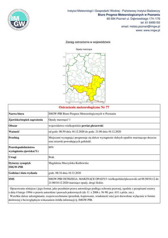 Ostrzeżenie meteorologiczne nr 77 - opady marznące/1 - 10.12.2020 r.