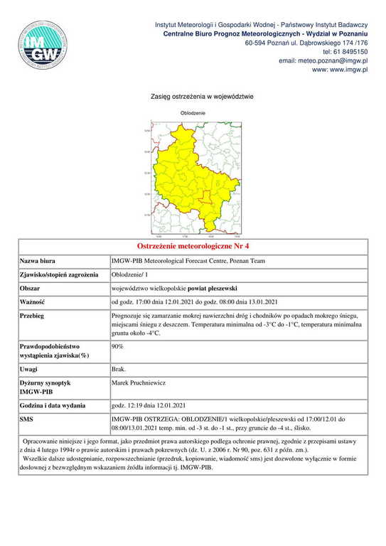 Ostrzeżenie meteorologiczne nr 4 - oblodzenie/1 - 12.01.2021 r. Opublikowano: 12 stycznia 2021 12:48 Kategoria: Komunikaty i ostrzeżenia WydrukujDo góry Wyświetleń: 270 Zobacz również03.02.2021 Ostrzeżenie meteorologiczne Nr 11 - Silny wiatr/... 28.01.2021 Ostrzeżenie meteorologiczne Nr 10 - Oblodzenie/ 1... 13.01.2021 Ostrzeżenie meteorologiczne Nr 5 - Oblodzenie/ 1... 12.01.2021 Ostrzeżenie meteorologiczne nr 4 - oblodzenie/1 -... 21.12.2020 Harmonogram polowań zbiorowych 10.12.2020 Ostrzeżenie meteorologiczne nr 77 - opady...