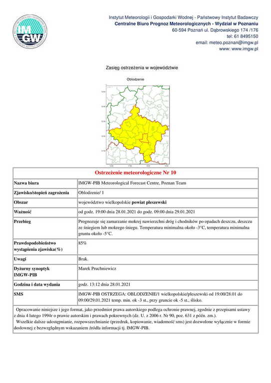 Ostrzeżenie meteorologiczne Nr 10 - Oblodzenie/ 1 - 28.01.2021 r. Opublikowano: 28 stycznia 2021 16:40 Kategoria: Komunikaty i ostrzeżenia WydrukujDo góry Wyświetleń: 703 Zobacz również08.02.2021 Ostrzeżenie meteorologiczne Nr 14 -... 08.02.2021 Ostrzeżenie meteorologiczne Nr 13 - Intensywne... 03.02.2021 Ostrzeżenie meteorologiczne Nr 11 - Silny wiatr/... 28.01.2021 Ostrzeżenie meteorologiczne Nr 10 - Oblodzenie/ 1... 13.01.2021 Ostrzeżenie meteorologiczne Nr 5 - Oblodzenie/ 1... 12.01.2021 Ostrzeżenie meteorologiczne nr 4 - oblodzenie/1 -...