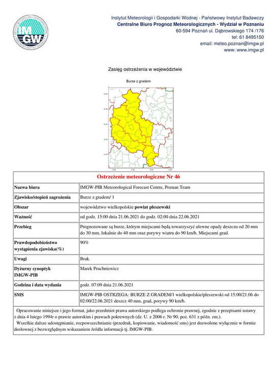 Ostrzeżenie meteorologiczne Nr 46 - Burze z gradem/ 1 Opublikowano: 21 czerwca 2021 08:49 Kategoria: Komunikaty i ostrzeżenia WydrukujDo góry Wyświetleń: 790 Zobacz również07.07.2021 Ostrzeżenie meteorologiczne Nr 52 - Burze z... 24.06.2021 Ostrzeżenie meteorologiczne Nr 49 - Burze z... 22.06.2021 Ostrzeżenie meteorologiczne Nr 47 - Burze z... 21.06.2021 Ostrzeżenie meteorologiczne Nr 46 - Burze z... 17.06.2021 Ostrzeżenie meteorologiczne Nr 45 - Upał/ stopień... 08.06.2021 Zarządzenie Nr SG.0050.21.2021 Burmistrza Gminy...