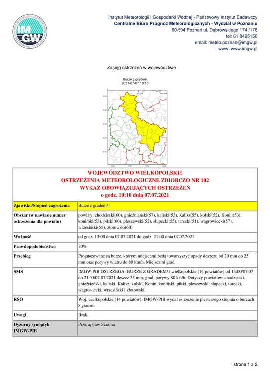 Ostrzeżenie meteorologiczne Nr 52 - Burze z gradem/ 1 Opublikowano: 07 lipca 2021 11:49 Kategoria: Komunikaty i ostrzeżenia WydrukujDo góry Wyświetleń: 266 Zobacz również09.07.2021 Ostrzeżenie meteorologiczne Nr 54 - Burze z... 08.07.2021 Zmiana ostrzeżenia meteorologicznego Nr 53... 08.07.2021 Ostrzeżenie meteorologiczne Nr 53 - Burze z... 07.07.2021 Ostrzeżenie meteorologiczne Nr 52 - Burze z... 24.06.2021 Ostrzeżenie meteorologiczne Nr 49 - Burze z... 22.06.2021 Ostrzeżenie meteorologiczne Nr 47 - Burze z...