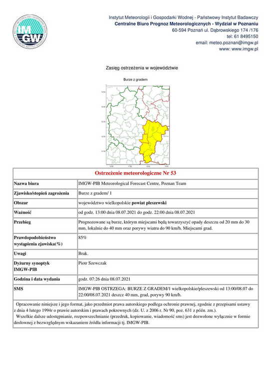 Ostrzeżenie meteorologiczne Nr 53 - Burze z gradem/ 1 Opublikowano: 08 lipca 2021 08:15 Kategoria: Komunikaty i ostrzeżenia WydrukujDo góry Wyświetleń: 185 Zobacz również12.07.2021 Ostrzeżenie meteorologiczne Nr 56 - Burze z... 09.07.2021 Ostrzeżenie meteorologiczne Nr 54 - Burze z... 08.07.2021 Zmiana ostrzeżenia meteorologicznego Nr 53... 08.07.2021 Ostrzeżenie meteorologiczne Nr 53 - Burze z... 07.07.2021 Ostrzeżenie meteorologiczne Nr 52 - Burze z... 24.06.2021 Ostrzeżenie meteorologiczne Nr 49 - Burze z...