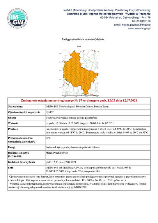 Ostrzeżenie meteorologiczne Nr 57 - Upał/ 2 Opublikowano: 13 lipca 2021 11:07 Kategoria: Komunikaty i ostrzeżenia WydrukujDo góry Wyświetleń: 235 Zobacz również16.07.2021 Ostrzeżenie meteorologiczne Nr 60 - Burze z... 15.07.2021 Ostrzeżenie meteorologiczne Nr 59 - Burze z... 14.07.2021 Ostrzeżenie meteorologiczne Nr 58 - Burze z... 13.07.2021 Ostrzeżenie meteorologiczne Nr 57 - Upał/ 2 12.07.2021 Ostrzeżenie meteorologiczne Nr 56 - Burze z... 09.07.2021 Ostrzeżenie meteorologiczne Nr 54 - Burze z...