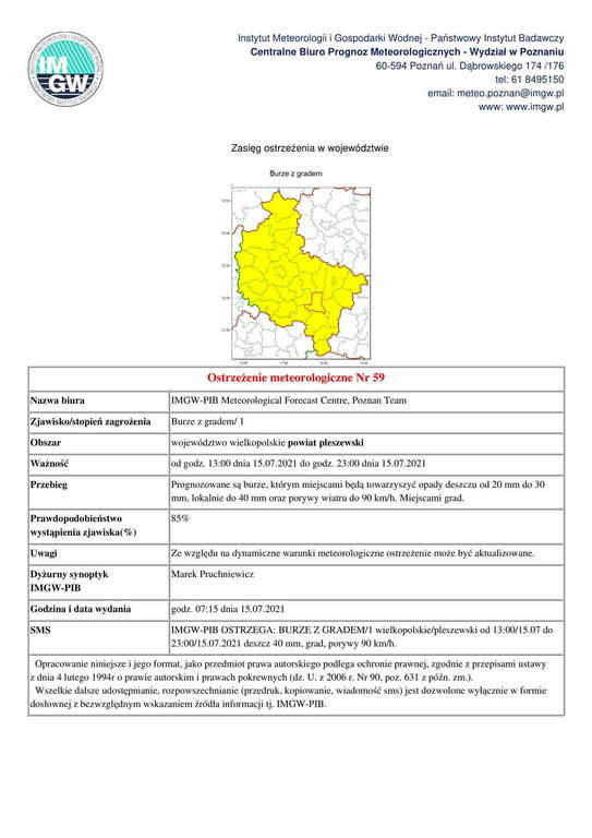 Ostrzeżenie meteorologiczne Nr 59 - Burze z gradem/ 1 Opublikowano: 15 lipca 2021 09:52 Kategoria: Komunikaty i ostrzeżenia WydrukujDo góry Wyświetleń: 271 Zobacz również16.08.2021 Ostrzeżenie meteorologiczne Nr 66 - Burze z... 28.07.2021 Ostrzeżenie meteorologiczne Nr 63 - Burze z... 16.07.2021 Ostrzeżenie meteorologiczne Nr 60 - Burze z... 15.07.2021 Ostrzeżenie meteorologiczne Nr 59 - Burze z... 14.07.2021 Ostrzeżenie meteorologiczne Nr 58 - Burze z... 13.07.2021 Ostrzeżenie meteorologiczne Nr 57 - Upał/ 2