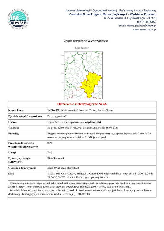 Ostrzeżenie meteorologiczne Nr 66 - Burze z gradem/ 1 Opublikowano: 16 sierpnia 2021 10:09 Kategoria: Komunikaty i ostrzeżenia WydrukujDo góry Wyświetleń: 280 Zobacz również24.09.2021 Komunikat Państwowego Powiatowego Inspektora... 23.09.2021 Ostrzeżenie meteorologiczne Nr 70 - Silny wiatr/... 23.08.2021 Ostrzeżenie meteorologiczne Nr 67 - Intensywne... 16.08.2021 Ostrzeżenie meteorologiczne Nr 66 - Burze z... 28.07.2021 Ostrzeżenie meteorologiczne Nr 63 - Burze z... 16.07.2021 Ostrzeżenie meteorologiczne Nr 60 - Burze z...
