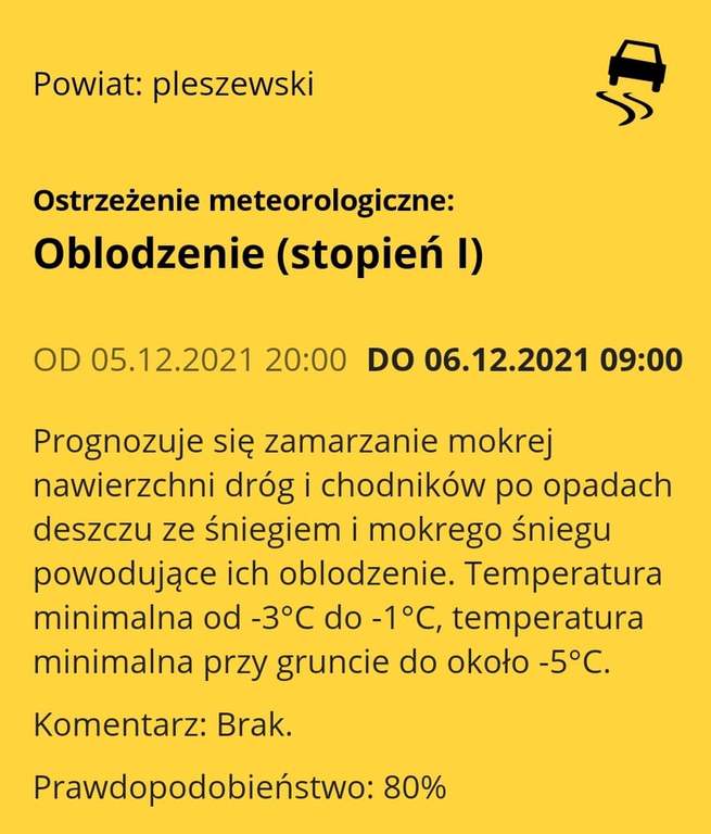 Ostrzeżenie meteorologiczne Nr 77 - Oblodzenie/ 1 - 05.12.2021 Opublikowano: 05 grudnia 2021 17:40 Kategoria: Komunikaty i ostrzeżenia WydrukujDo góry Wyświetleń: 237 Zobacz również16.12.2021 Harmonogram polowań zbiorowych 13.12.2021 Ostrzeżenie meteorologiczne Nr 78 - Opady... 07.12.2021 Harmonogram polowań zbiorowych 05.12.2021 Ostrzeżenie meteorologiczne Nr 77 - Oblodzenie/ 1... 01.12.2021 Ostrzeżenie meteorologiczne Nr 76 - Silny wiatr/... 29.11.2021 Harmonogram polowań zbiorowych