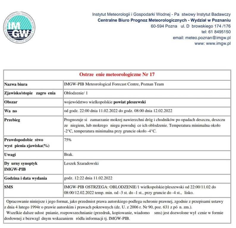 Ostrzeżenie meteorologiczne Nr 17 - Oblodzenie/ 1 - 11.02.2022 Opublikowano: 11 lutego 2022 12:53 Kategoria: Komunikaty i ostrzeżenia WydrukujDo góry Wyświetleń: 365 Zobacz również05.05.2022 Ostrzeżenie meteorologiczne Nr 30 - Burze z... 07.04.2022 Ostrzeżenie meteorologiczne Nr 23 - Silny wiatr/... 16.02.2022 Ostrzeżenie meteorologiczne Nr 17 - Silny wiatr/... 11.02.2022 Ostrzeżenie meteorologiczne Nr 17 - Oblodzenie/ 1... 29.01.2022 Ostrzeżenie meteorologiczne - Silny wiatr -... 16.01.2022 Ostrzeżenie meteorologiczne Nr 4 - Silny wiatr/ 2...