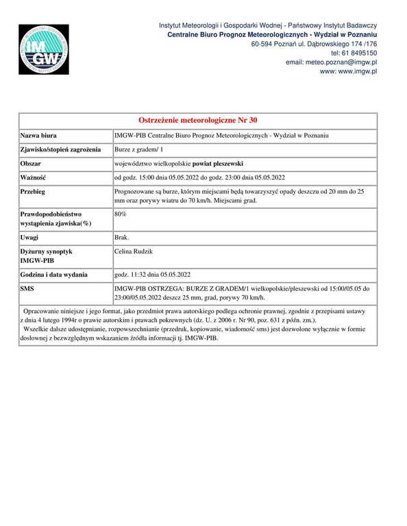 Ostrzeżenie meteorologiczne Nr 30 - Burze z gradem/ 1 Opublikowano: 05 maja 2022 13:02 Kategoria: Komunikaty i ostrzeżenia WydrukujDo góry Wyświetleń: 254 Zobacz również24.05.2022 Ostrzeżenie meteorologiczne Nr 34 - Burze/ 1 20.05.2022 Ostrzeżenie meteorologiczne Nr 33 - Silny wiatr 20.05.2022 Ostrzeżenie meteorologiczne Nr 32 - Burze z... 05.05.2022 Ostrzeżenie meteorologiczne Nr 30 - Burze z... 07.04.2022 Ostrzeżenie meteorologiczne Nr 23 - Silny wiatr/... 16.02.2022 Ostrzeżenie meteorologiczne Nr 17 - Silny wiatr/...