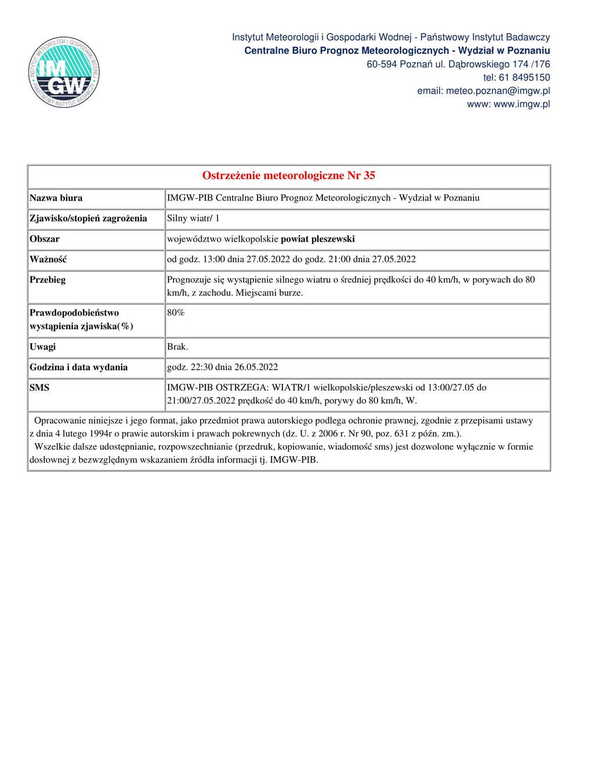 Ostrzeżenie meteorologiczne Nr 35 - Silny wiatr / 1
