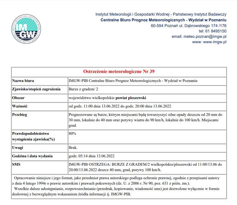 Ostrzeżenie meteorologiczne Nr 39 - Burze z gradem/ 2