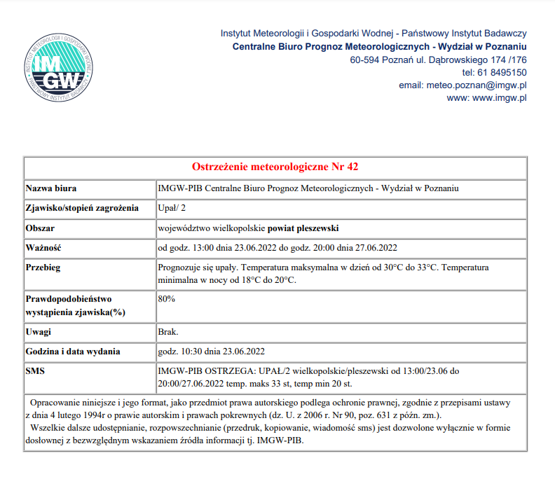 Ostrzeżenie meteorologiczne Nr 42 - Upał/ 2