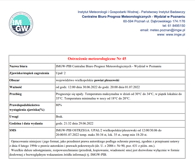 Ostrzeżenie meteorologiczne Nr 45 - Upał/ 2