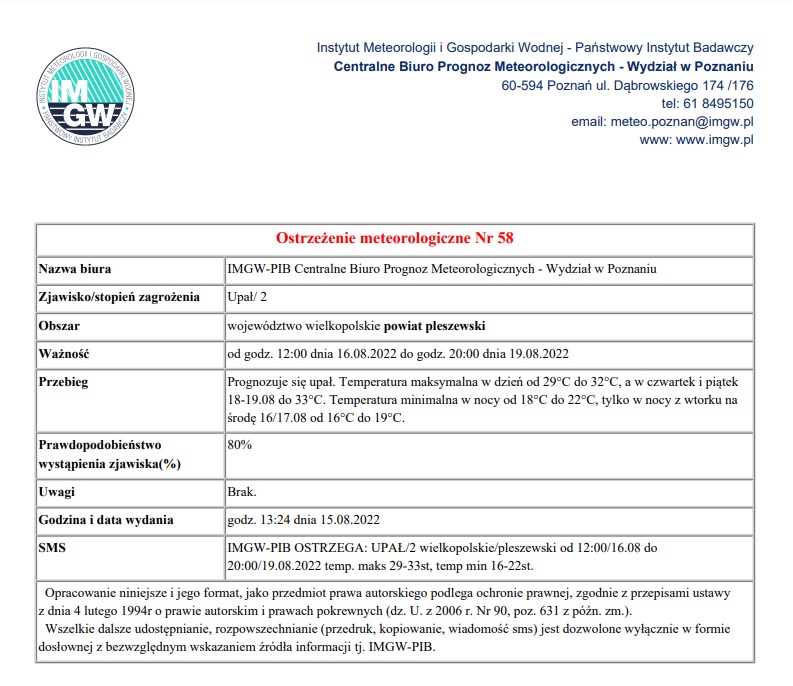 Ostrzeżenie meteorologiczne Nr 58 - Upał/ 2
