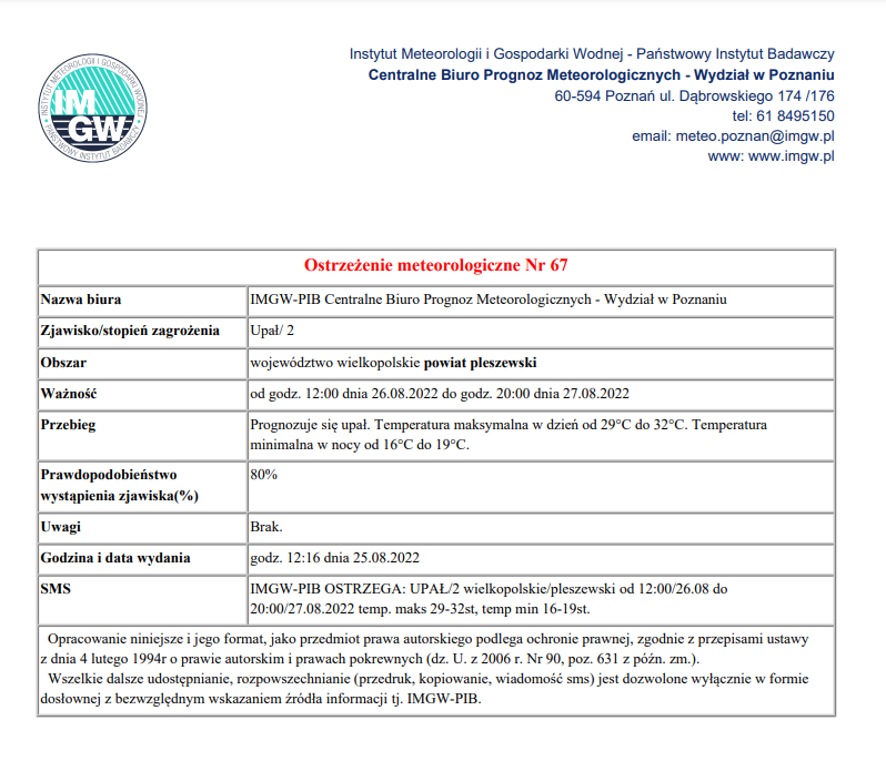 Ostrzeżenie meteorologiczne Nr 67 - Upał/ 2