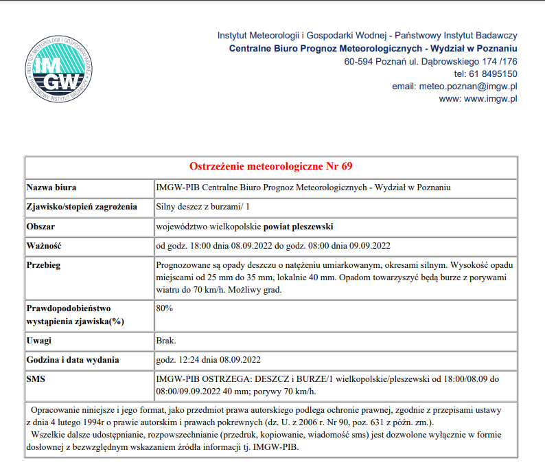 Ostrzeżenie meteorologiczne Nr 69 - Silny deszcz z burzami - stopień 1