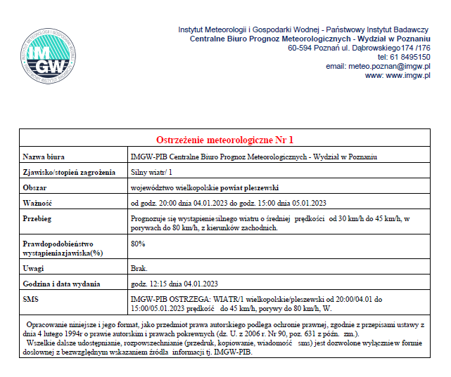 Ostrzeżenie meteorologiczne Nr 1 - Silny wiatr/ 1 - 04.01.2023