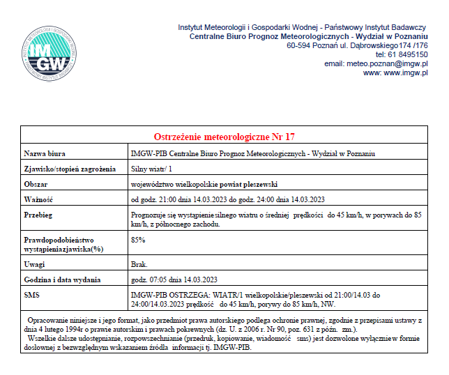 Ostrzeżenie meteorologiczne Nr 17 - Silny wiatr/ 1 - 14.03.2023 Opublikowano: 14 marca 2023 08:51 Kategoria: Komunikaty i ostrzeżenia WydrukujDo góry Wyświetleń: 416 Zobacz również26.06.2023 Ostrzeżenie meteorologiczne Nr 37 - Burze z... 22.06.2023 Ostrzeżenie meteorologiczne Nr 36 - Burze z... 21.06.2023 Ostrzeżenie meteorologiczne Nr 35 - Burze z... 14.03.2023 Ostrzeżenie meteorologiczne Nr 17 - Silny wiatr/... 20.02.2023 Ostrzeżenie meteorologiczne Nr 11 - Silny wiatr/... 17.02.2023 Ostrzeżenie meteorologiczne Nr 10 - Silny wiatr/...