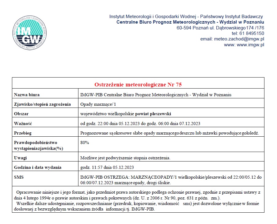 Ostrzeżenie meteorologiczne Nr 75 - Opady marznące/ 1 - 25.12.2023 Opublikowano: 05 grudnia 2023 12:45 Kategoria: Komunikaty i ostrzeżenia WydrukujDo góry Wyświetleń: 202 Zobacz również08.12.2023 Ostrzeżenie meteorologiczne Nr 78 - Opady... 07.12.2023 Ostrzeżenie meteorologiczne Nr 77 - Opady... 06.12.2023 Ostrzeżenie meteorologiczne Nr 76 - Gęsta mgła/ 1... 05.12.2023 Ostrzeżenie meteorologiczne Nr 75 - Opady... 23.11.2023 Ostrzeżenie meteorologiczne Nr 73 - Silny wiatr/... 21.11.2023 Ostrzeżenie meteorologiczne Nr - Oblodzenie/1 -...