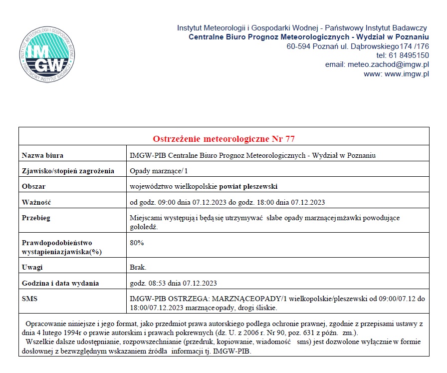 Ostrzeżenie meteorologiczne Nr 77 - Opady marznące/ 1 - 27.12.2023 Opublikowano: 07 grudnia 2023 10:11 Kategoria: Komunikaty i ostrzeżenia WydrukujDo góry Wyświetleń: 141 Zobacz również21.12.2023 Ostrzeżenie meteorologiczne Nr 81 - Silny wiatr/... 21.12.2023 Ostrzeżenie meteorologiczne Nr 80 - Silny wiatr/... 08.12.2023 Ostrzeżenie meteorologiczne Nr 78 - Opady... 07.12.2023 Ostrzeżenie meteorologiczne Nr 77 - Opady... 06.12.2023 Ostrzeżenie meteorologiczne Nr 76 - Gęsta mgła/ 1... 05.12.2023 Ostrzeżenie meteorologiczne Nr 75 - Opady...