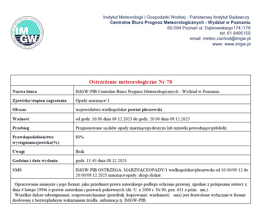Ostrzeżenie meteorologiczne Nr 78 - Opady marznące/ 1 - 28.12.2023 Opublikowano: 08 grudnia 2023 13:23 Kategoria: Komunikaty i ostrzeżenia WydrukujDo góry Wyświetleń: 167 Zobacz również27.12.2023 105. rocznica wybuchu Powstania Wielkopolskiego 21.12.2023 Ostrzeżenie meteorologiczne Nr 81 - Silny wiatr/... 21.12.2023 Ostrzeżenie meteorologiczne Nr 80 - Silny wiatr/... 08.12.2023 Ostrzeżenie meteorologiczne Nr 78 - Opady... 07.12.2023 Ostrzeżenie meteorologiczne Nr 77 - Opady... 06.12.2023 Ostrzeżenie meteorologiczne Nr 76 - Gęsta mgła/ 1...