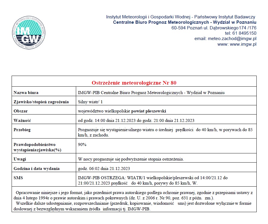 Ostrzeżenie meteorologiczne Nr 80 - Silny wiatr/ 1 - 21.12.2023 Opublikowano: 21 grudnia 2023 12:16 Kategoria: Komunikaty i ostrzeżenia WydrukujDo góry Wyświetleń: 193 Zobacz również04.01.2024 Ostrzeżenie meteorologiczne Nr 1 - Oblodzenie/1 -... 27.12.2023 105. rocznica wybuchu Powstania Wielkopolskiego 21.12.2023 Ostrzeżenie meteorologiczne Nr 81 - Silny wiatr/... 21.12.2023 Ostrzeżenie meteorologiczne Nr 80 - Silny wiatr/... 08.12.2023 Ostrzeżenie meteorologiczne Nr 78 - Opady... 07.12.2023 Ostrzeżenie meteorologiczne Nr 77 - Opady...