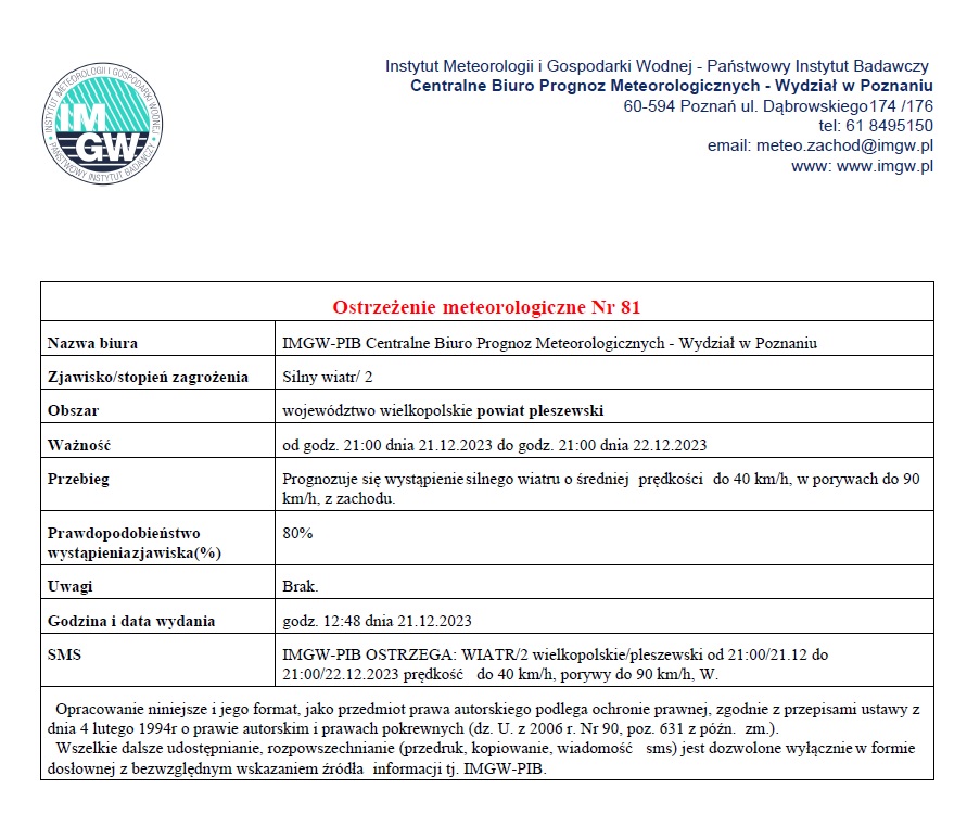 Ostrzeżenie meteorologiczne Nr 81 - Silny wiatr/ 2 - 21.12.2023 Opublikowano: 21 grudnia 2023 13:13 Kategoria: Komunikaty i ostrzeżenia WydrukujDo góry Wyświetleń: 177 Zobacz również08.01.2024 Ostrzeżenie meteorologiczne Nr 4 - Silny mróz/1 -... 04.01.2024 Ostrzeżenie meteorologiczne Nr 1 - Oblodzenie/1 -... 27.12.2023 105. rocznica wybuchu Powstania Wielkopolskiego 21.12.2023 Ostrzeżenie meteorologiczne Nr 81 - Silny wiatr/... 21.12.2023 Ostrzeżenie meteorologiczne Nr 80 - Silny wiatr/... 08.12.2023 Ostrzeżenie meteorologiczne Nr 78 - Opady...