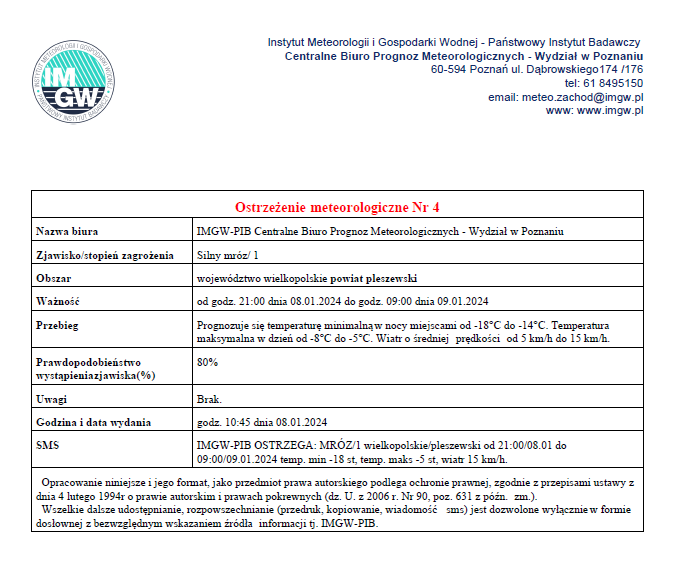 Ostrzeżenie meteorologiczne Nr 4 - Silny mróz/1 - 08.01.2023r Opublikowano: 08 stycznia 2024 12:29 Kategoria: Komunikaty i ostrzeżenia WydrukujDo góry Wyświetleń: 184 Zobacz również12.02.2024 Wprowadzenie Pogotowia Przeciwpowodziowego 23.01.2024 Ostrzeżenie meteorologiczne Nr 11 - Silny wiatr/... 17.01.2024 Ostrzeżenie meteorologiczne Nr 9 - Opady... 08.01.2024 Ostrzeżenie meteorologiczne Nr 4 - Silny mróz/1 -... 04.01.2024 Ostrzeżenie meteorologiczne Nr 1 - Oblodzenie/1 -... 27.12.2023 105. rocznica wybuchu Powstania Wielkopolskiego