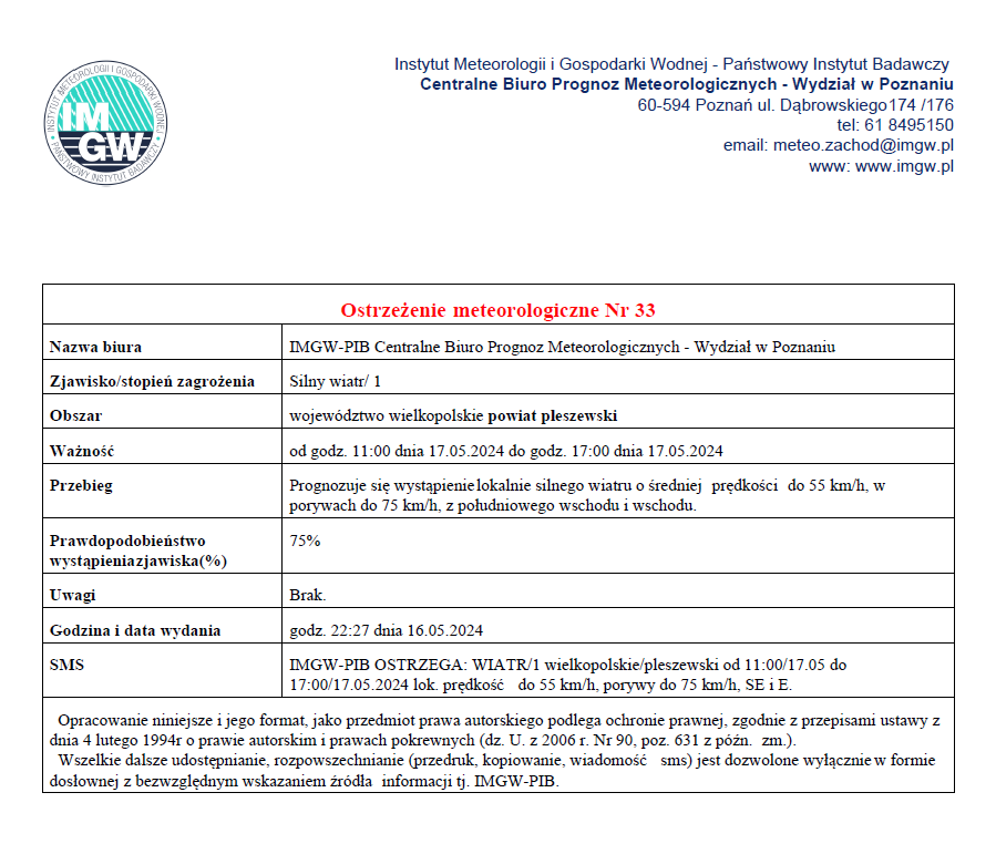 Ostrzeżenie meteorologiczne Nr 33 - Silny wiatr/ 1 - 17.05.2024 Opublikowano: 17 maja 2024 12:52 Kategoria: Komunikaty i ostrzeżenia WydrukujDo góry Wyświetleń: 274 Zobacz również21.06.2024 Ostrzeżenie meteorologiczne Nr 53 - Burze/ 2 -... 30.05.2024 Ostrzeżenie meteorologiczne Nr 43 - Burze/ 2 -... 22.05.2024 Ostrzeżenie meteorologiczne Nr 37 - Burze/ 2 -... 17.05.2024 Ostrzeżenie meteorologiczne Nr 33 - Silny wiatr/... 05.05.2024 Ostrzeżenie meteorologiczne Nr 30 - Burze z... 21.02.2024 Obszar zagrożony Ptasią Grypą na terenie gminy...
