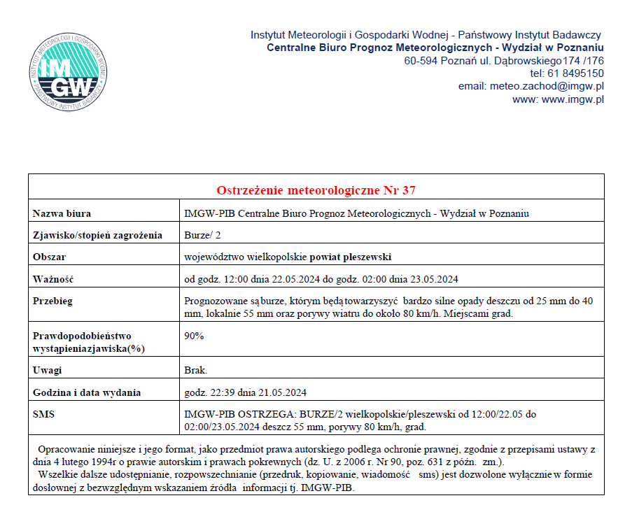 Ostrzeżenie meteorologiczne Nr 37 - Burze/ 2 - 22.05.2024 Opublikowano: 22 maja 2024 12:10 Kategoria: Komunikaty i ostrzeżenia WydrukujDo góry Wyświetleń: 259 Zobacz również27.06.2024 Ostrzeżenie meteorologiczne Nr 55 - Burze/ 1 -... 21.06.2024 Ostrzeżenie meteorologiczne Nr 53 - Burze/ 2 -... 30.05.2024 Ostrzeżenie meteorologiczne Nr 43 - Burze/ 2 -... 22.05.2024 Ostrzeżenie meteorologiczne Nr 37 - Burze/ 2 -... 17.05.2024 Ostrzeżenie meteorologiczne Nr 33 - Silny wiatr/... 05.05.2024 Ostrzeżenie meteorologiczne Nr 30 - Burze z...