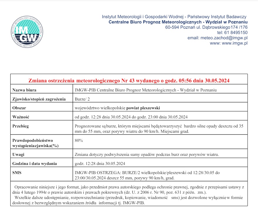 Ostrzeżenie meteorologiczne Nr 43 - Burze/ 2 - 30.05.2024 Opublikowano: 30 maja 2024 13:21 Kategoria: Komunikaty i ostrzeżenia WydrukujDo góry Wyświetleń: 215 Zobacz również28.06.2024 Ostrzeżenie meteorologiczne Nr 56 - Burze/ 2 -... 27.06.2024 Ostrzeżenie meteorologiczne Nr 55 - Burze/ 1 -... 21.06.2024 Ostrzeżenie meteorologiczne Nr 53 - Burze/ 2 -... 30.05.2024 Ostrzeżenie meteorologiczne Nr 43 - Burze/ 2 -... 22.05.2024 Ostrzeżenie meteorologiczne Nr 37 - Burze/ 2 -... 17.05.2024 Ostrzeżenie meteorologiczne Nr 33 - Silny wiatr/...