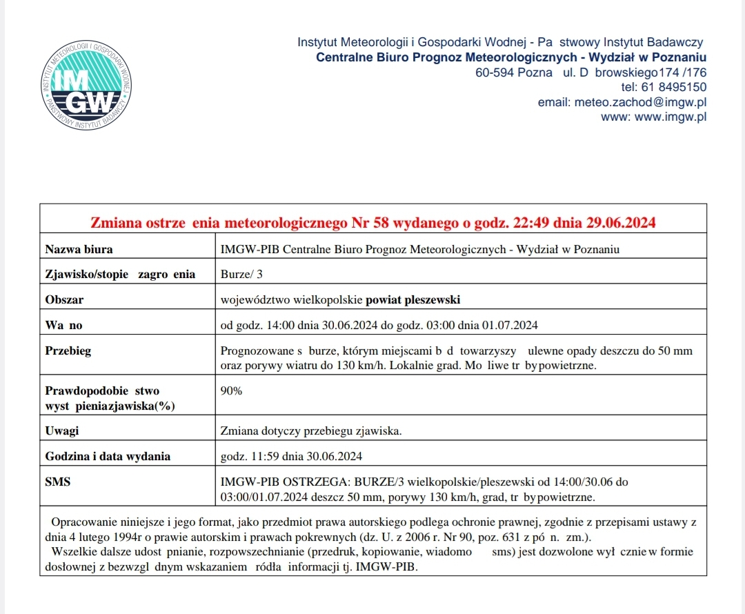 Ostrzeżenie meteorologiczne Nr 58 - Burze/ 3 - 30.06.2024 Opublikowano: 30 czerwca 2024 08:06 Kategoria: Komunikaty i ostrzeżenia WydrukujDo góry Wyświetleń: 150 Zobacz również10.07.2024 Ostrzeżenie meteorologiczne Nr 64 - Burze/ 2 -... 09.07.2024 Ostrzeżenie meteorologiczne Nr 63 - Upał/ 2 -... 05.07.2024 Ostrzeżenie meteorologiczne Nr 61 - Upał/ 1 -... 30.06.2024 Ostrzeżenie meteorologiczne Nr 58 - Burze/ 3 -... 28.06.2024 Ostrzeżenie meteorologiczne Nr 56 - Burze/ 2 -... 27.06.2024 Ostrzeżenie meteorologiczne Nr 55 - Burze/ 1 -...