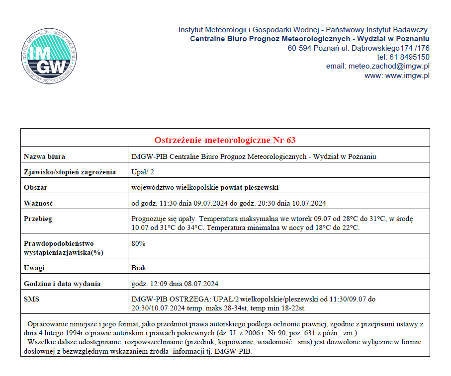 Ostrzeżenie meteorologiczne Nr 63 - Upał/ 2 - 08.07.2024 Opublikowano: 09 lipca 2024 10:50 Kategoria: Komunikaty i ostrzeżenia WydrukujDo góry Wyświetleń: 151 Zobacz również16.07.2024 Ostrzeżenie meteorologiczne Nr 70 - Burze/ 2 -... 12.07.2024 Ostrzeżenie meteorologiczne Nr 66 - Upał/ 1 oraz... 10.07.2024 Ostrzeżenie meteorologiczne Nr 64 - Burze/ 2 -... 09.07.2024 Ostrzeżenie meteorologiczne Nr 63 - Upał/ 2 -... 05.07.2024 Ostrzeżenie meteorologiczne Nr 61 - Upał/ 1 -... 30.06.2024 Ostrzeżenie meteorologiczne Nr 58 - Burze/ 3 -...