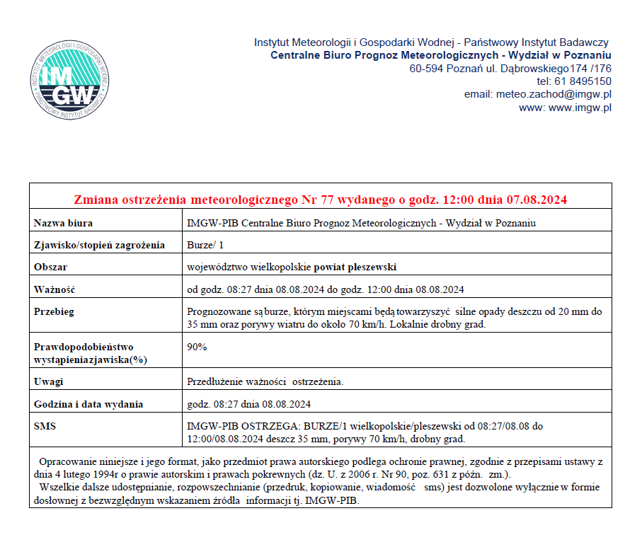 Ostrzeżenie meteorologiczne Nr 77 - Burze/ 1 - 08.08.2024 Opublikowano: 08 sierpnia 2024 09:48 Kategoria: Komunikaty i ostrzeżenia WydrukujDo góry Wyświetleń: 448 Zobacz również02.05.2025 Ostrzeżenie meteorologiczne Nr 26 - Burze/ 2 -... 13.02.2025 Ostrzeżenie meteorologiczne Nr 13 - Oblodzenie 11.09.2024 Ostrzeżenie meteorologiczne Nr 87 - Intensywne... 08.08.2024 Ostrzeżenie meteorologiczne Nr 77 - Burze/ 1 -... 22.07.2024 Ostrzeżenie meteorologiczne Nr 72 - Burze/ 2 -... 16.07.2024 Ostrzeżenie meteorologiczne Nr 70 - Burze/ 2 -...