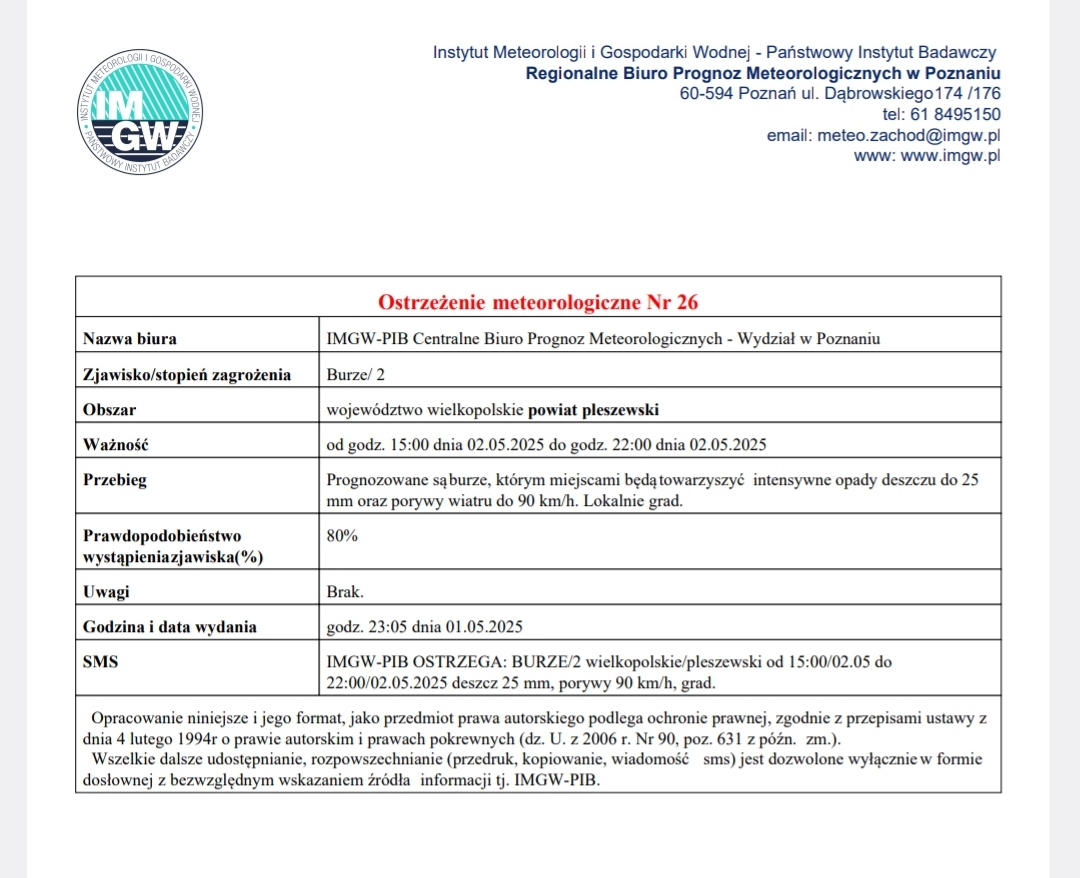 Ostrzeżenie meteorologiczne Nr 26 - Burze/ 2 - 02.05.2025 Opublikowano: 02 maja 2025 08:50 Kategoria: Komunikaty i ostrzeżenia WydrukujDo góry Wyświetleń: 163 Zobacz również01.07.2025 Ostrzeżenie meteorologiczne Nr 47 - Upał/ 2 23.06.2025 Ostrzeżenie meteorologiczne nr 44 - Upał/ 2, nr... 04.06.2025 Ostrzeżenie meteorologiczne Nr 40 - Burze/ 2 -... 02.05.2025 Ostrzeżenie meteorologiczne Nr 26 - Burze/ 2 -... 13.02.2025 Ostrzeżenie meteorologiczne Nr 13 - Oblodzenie 11.09.2024 Ostrzeżenie meteorologiczne Nr 87 - Intensywne...