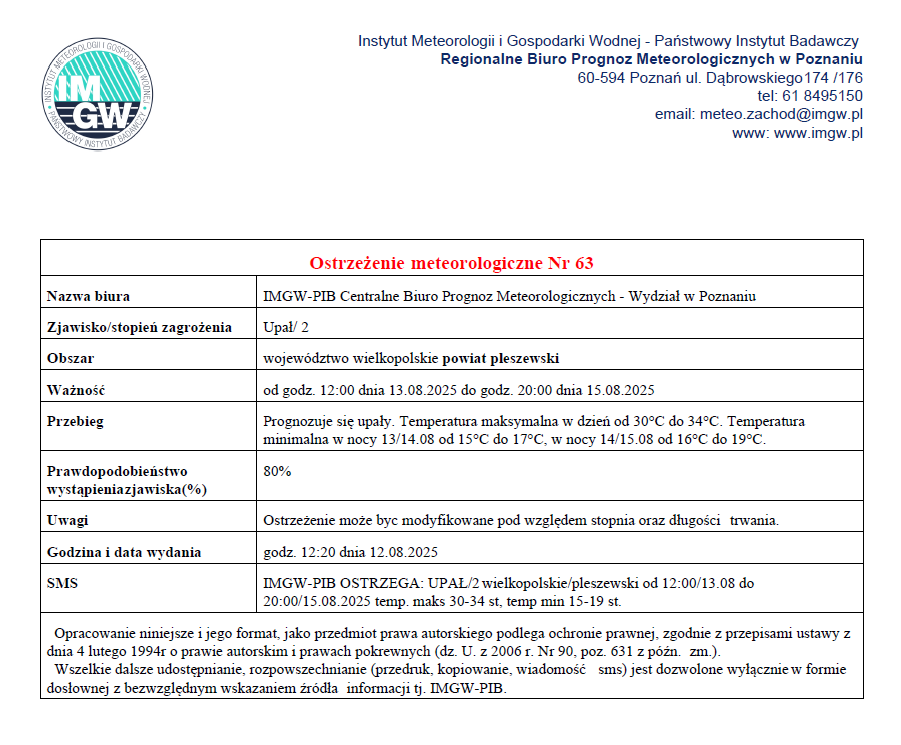 Ostrzeżenie meteorologiczne Nr 63 - Upał/ 2 Opublikowano: 13 sierpnia 2025 09:25 Kategoria: Komunikaty i ostrzeżenia WydrukujDo góry Wyświetleń: 77 Zobacz również13.08.2025 Ostrzeżenie meteorologiczne Nr 63 - Upał/ 2 01.07.2025 Ostrzeżenie meteorologiczne Nr 47 - Upał/ 2 23.06.2025 Ostrzeżenie meteorologiczne nr 44 - Upał/ 2, nr... 04.06.2025 Ostrzeżenie meteorologiczne Nr 40 - Burze/ 2 -... 02.05.2025 Ostrzeżenie meteorologiczne Nr 26 - Burze/ 2 -... 13.02.2025 Ostrzeżenie meteorologiczne Nr 13 - Oblodzenie